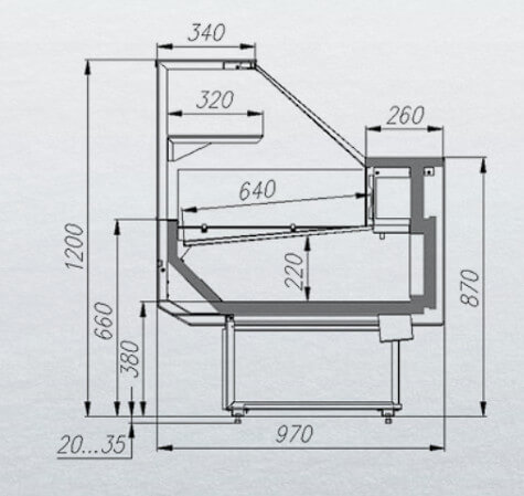 - Superficie espositiva: piano di lavoro in acciaio verniciato RAL9006