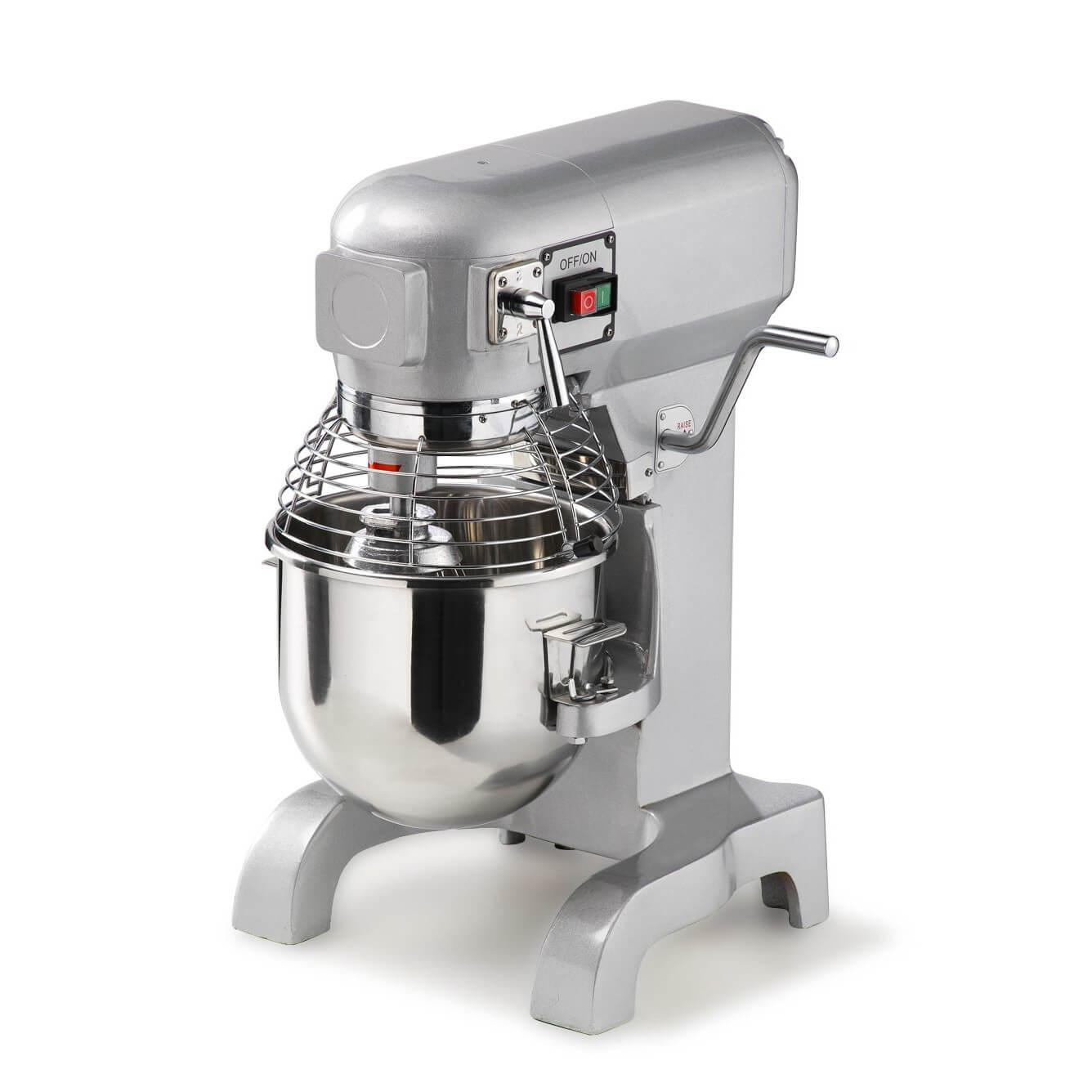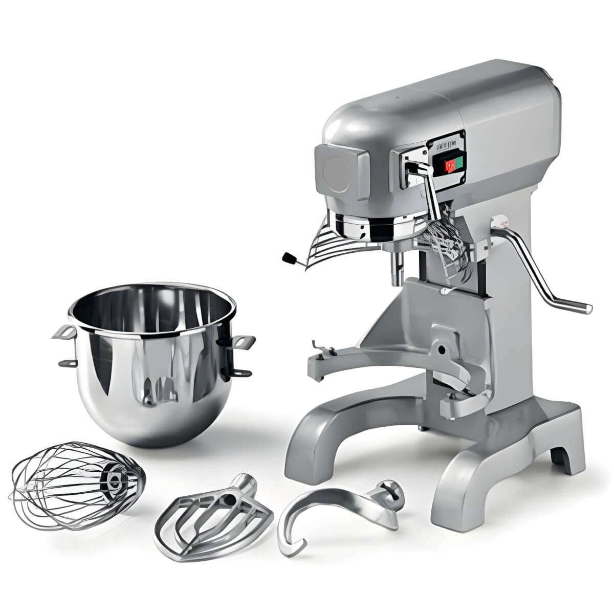 Der Planetenmischer besteht aus folgenden Materialien: Gehäuse aus lackiertem Aluminium und Gusseisen, leicht abnehmbare Schüssel aus rostfreiem Stahl, Arbeitsgeräte aus rostfreiem Stahl und Aluminium, Schutzgitter aus verchromtem Stahl.