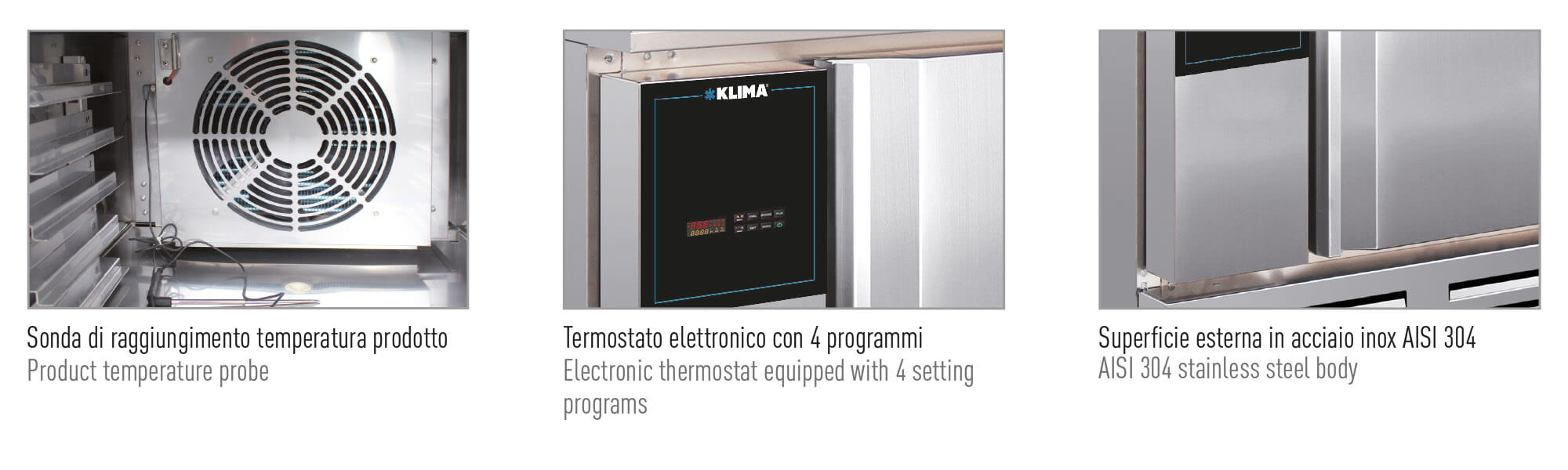 - Materiali: Superficie esterna ed interna (incluso cover evaporatore) in Acciaio Inox AISI 304.