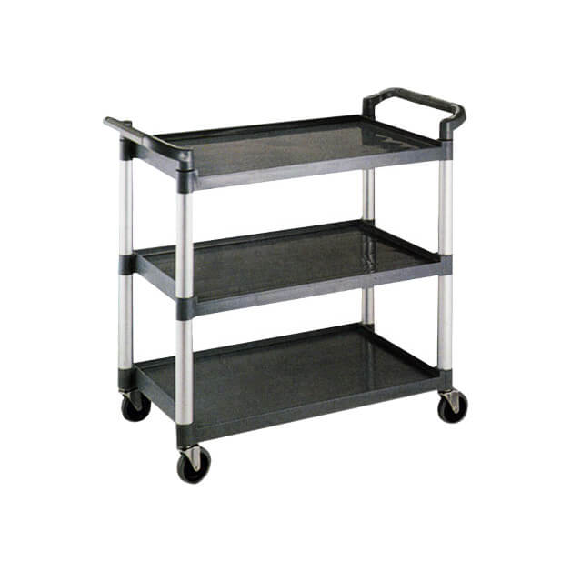 Carrello di servizio in plastica con aste di supporto in alluminio, 4 ruote girevoli senza freno e 3 ripiani in abs facilmente lavabili.