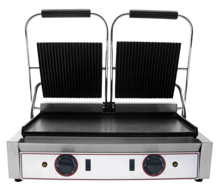 Kochplatte aus Gusseisen mit glattem Boden und gerippten Oberplatten.