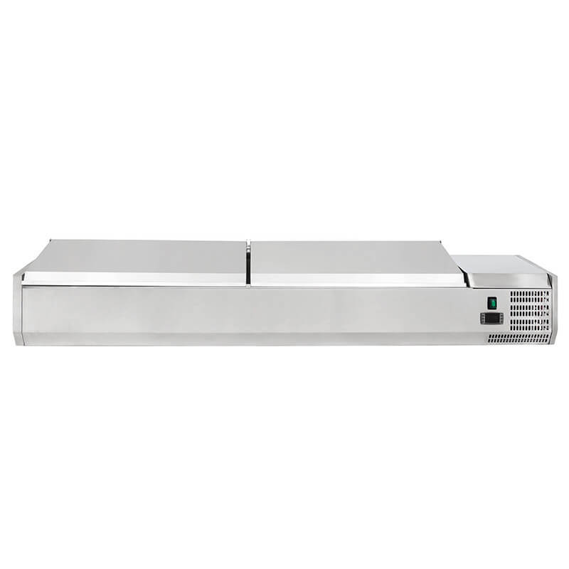 Edelstahl Pizzakühlvitrine mit statischer Kühlung. Schutzdeckel aus Edelstahl für eine bessere Konservierung der Lebensmittel, Einbaueinheit auf der rechten Seite nur Gas R600a. Geeignet für die Aufnahme von Gastronorm-Schalen aus Edelstahl oder Polycarbonat (Schalen ausgeschlossen)