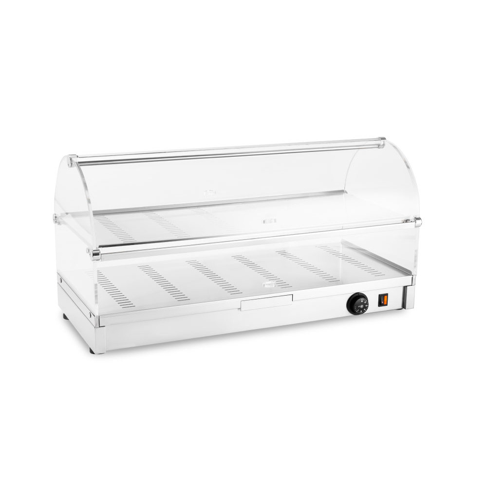 Beheizte Vitrine mit runden Türen, erhältlich in Edelstahl- oder Goldausführung, 2 Etagen, 4-seitiges PlexiGlas
