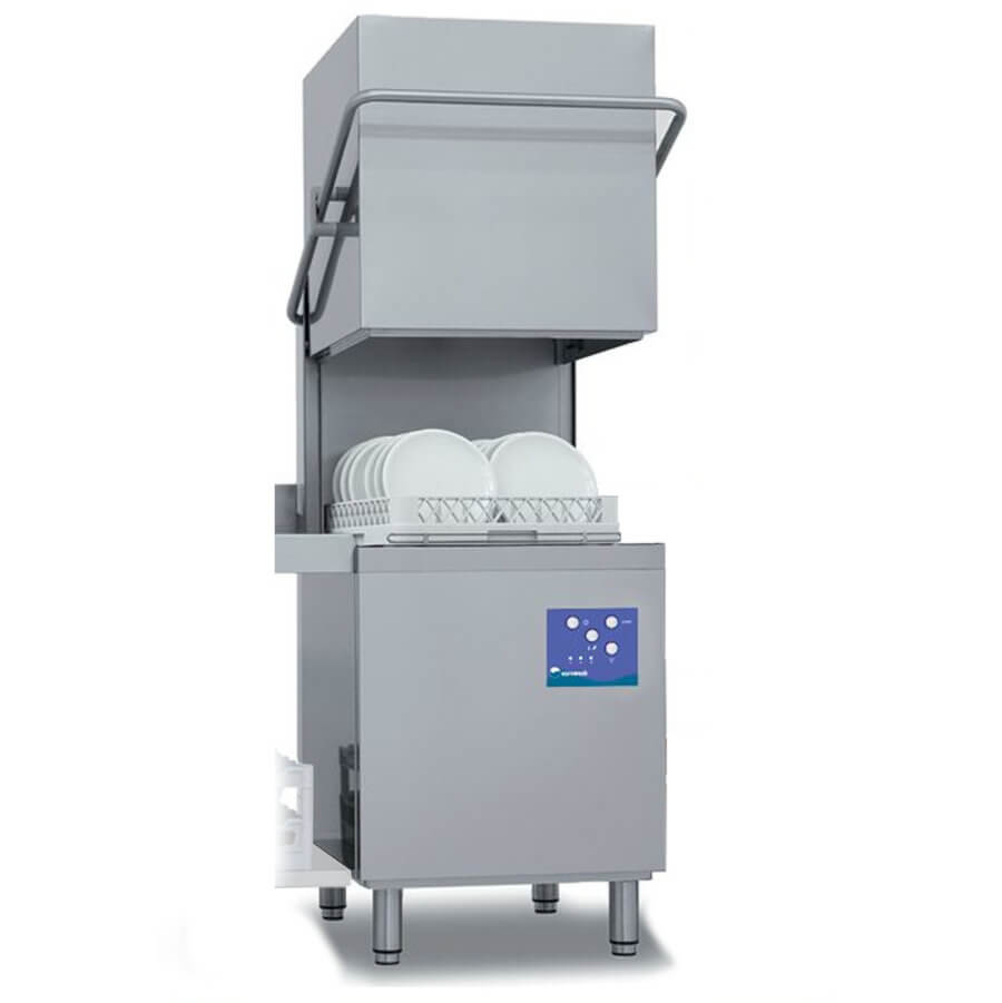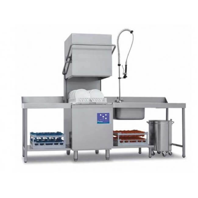 Einwandiger Profi-Geschirrspüler, einwandige Haube, geformte Wanne, Korbhalterung aus Draht, hydraulischer Klarspülerspender, elektromechanische Schnittstelle.