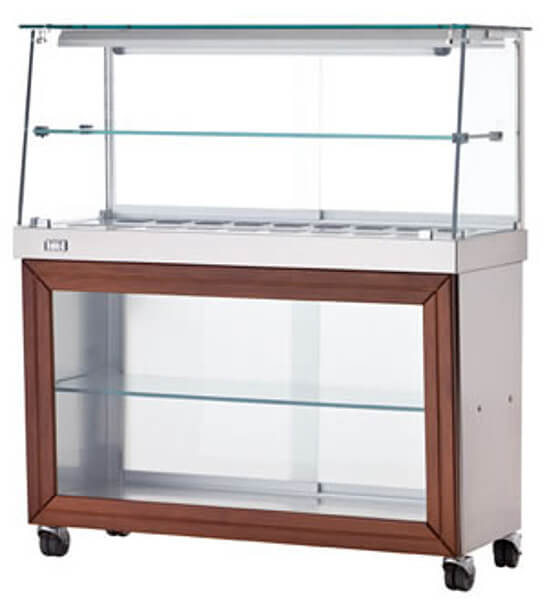 Serie von Warmhaltevitrinen auf Banketten für Pizzeria, Rotisserie und Patisserie.