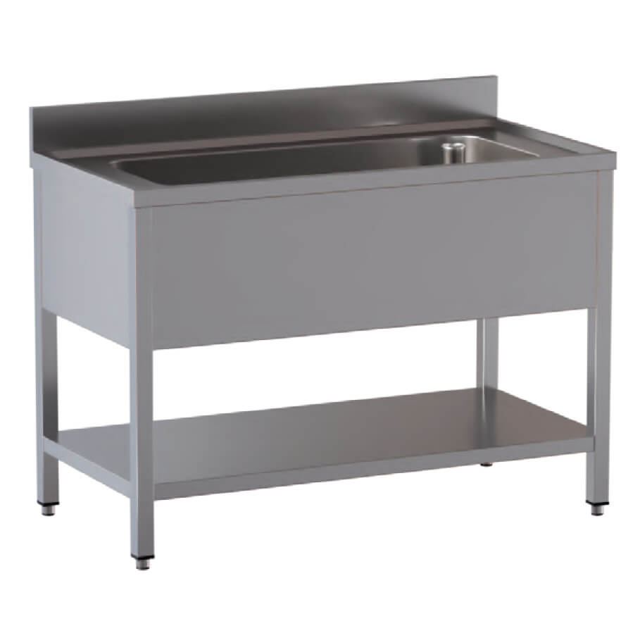 Lavatoio tutta vasca in acciaio inox Aisi 304 a giorno su 4 gambe quadrate, con 1 vascone. Profondità vasca 30 cm. Dotato di Alzatina.