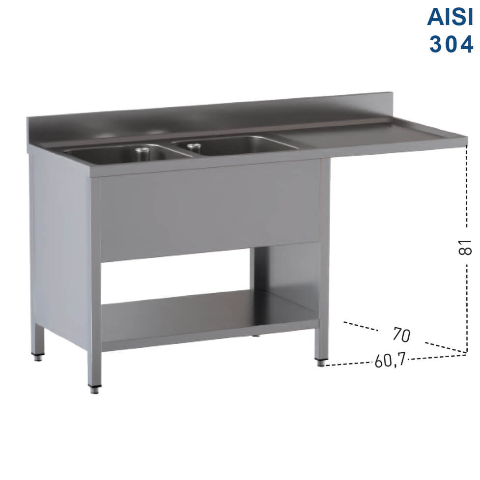 Lavatoio in acciaio inox Aisi 304 a giorno 2 vasche su 2 fianchi e ripiano inferiore, con vano lavastoviglie a destra. Vasca profonda 30 cm. Dotato di Alzatina.
