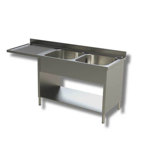 Lavatoio in acciaio inox Aisi 430 a giorno 2 vasche su 2 fianchi e ripiano inferiore, con vano lavastoviglie a sinistra. Vasca profondità 40 cm e altezza 30 cm. Dotato di Alzatina.
