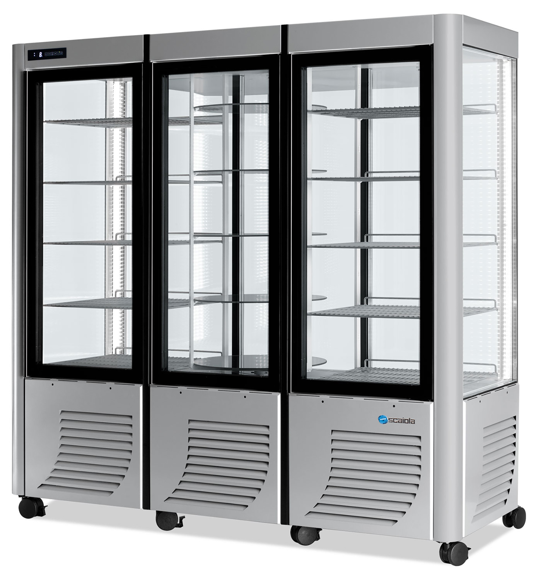 In seiner 3-türigen Version ist er mit Doppelverglasung und 5 runden Einlegeböden für die mittlere Tür und 5 quadratischen Einlegeböden für jede der Seitentüren ausgestattet, für eine optimale und elegante Präsentation. In ästhetischer Hinsicht überarbeitet, liefert Scaiola seine Produkte in 3 verschiedenen Standardfarben und Sie können optional bis zu 200 RAL-Farben wählen