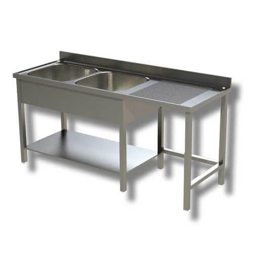 Offener Waschtisch aus Edelstahl Aisi 430 2 Becken auf 4 quadratischen Füßen und unterer Ablage, mit Mülleimerfach und Tropfschale rechts. Tiefe des Beckens 40 cm und Höhe 30 cm. Ausgestattet mit Aufkantung.