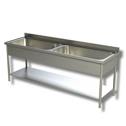 Offener Waschtisch aus Edelstahl Aisi 430 auf 4 quadratischen Füßen mit unterer Ablage, mit 2 Becken. Tiefe des Beckens 50 cm und Höhe 35 cm. Ausgestattet mit Spritzschutz.