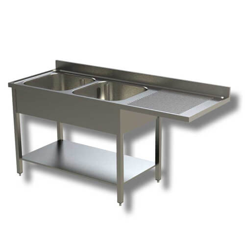 Offener Waschtisch aus Edelstahl Aisi 304 mit 2 Becken auf 4 quadratischen Füßen und unterer Ablage, mit Spülmaschinenfach auf der rechten Seite. Tiefe des Beckens 40 cm und Höhe 30 cm. Ausgestattet mit Spritzschutz.