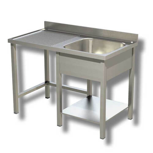 Offenes Waschbecken aus Edelstahl Aisi 430 mit 1 Becken auf 4 quadratischen Füßen und unterer Ablage, mit Mülleimerfach und Tropfschale links. Wanne 50×40 cm und Höhe 30 cm. Ausgestattet mit Spritzschutz.