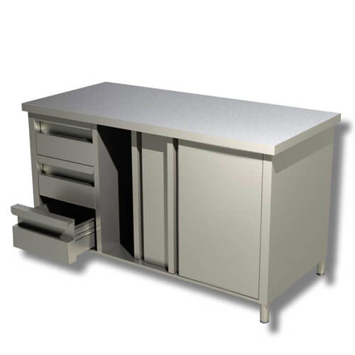 Schranktisch mit Schiebetüren 3 Schubladen links Aisi 430 Stahl Tiefe 70 cm