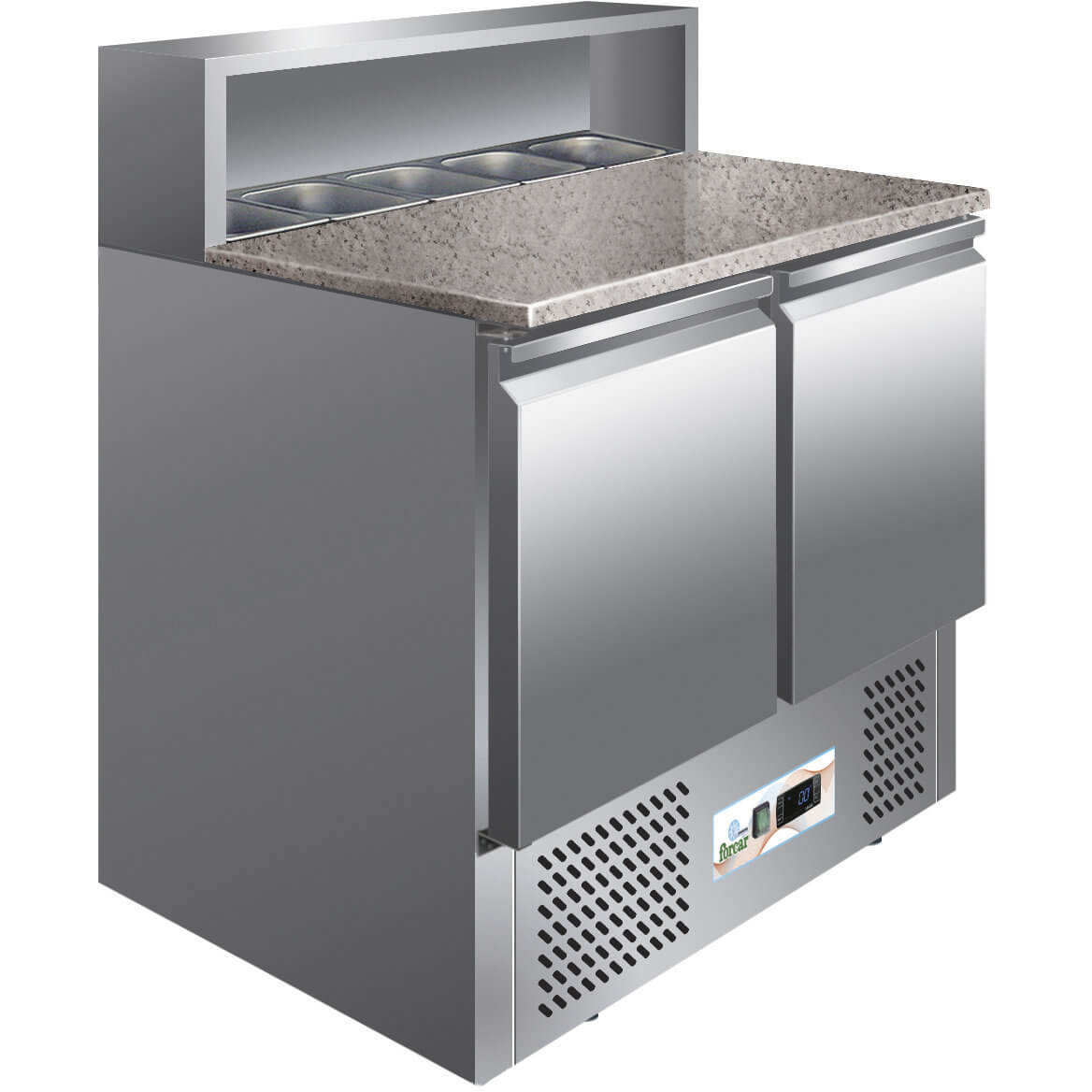 Gekühlte Salatbar. Konstruktion aus rostfreiem Stahl AISI 304. Automatische Abtauung. Dreiseitig geschäumter Verdampfer mit Ventilator. Deckel mit Teleskopöffnung. Arbeitsfläche aus lebensmittelechtem Polyethylen. Ein Zwischenrost pro Tür. Elektronischer Thermostat. Becken ausgeschlossen. Nr. 1 GN 1/1 Gitter pro Tür.