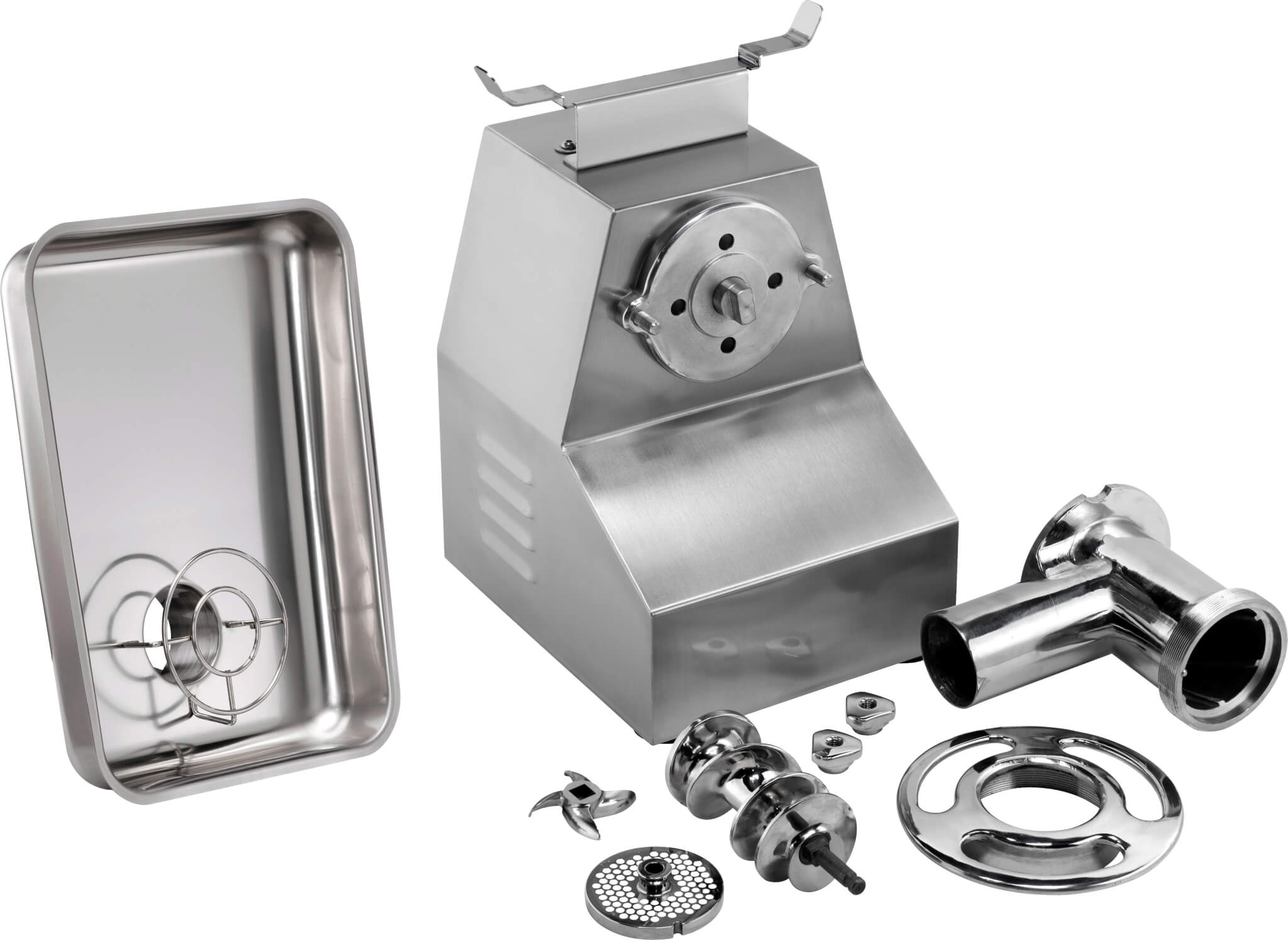 - Komplettes Unger-System aus Edelstahl für sehr feines Hackfleisch (z.B. Wurst) mit 2 Messern und 3 Platten 0 - 4,5 - 8 mm.