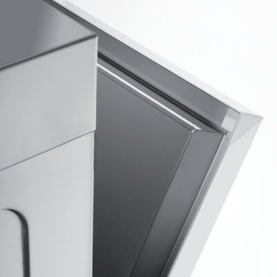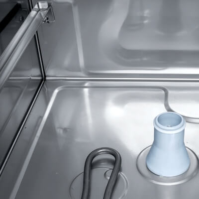 Gläserspüler in einwandiger Bauweise mit doppelwandiger Tür zur Reduzierung von Lärm und Wärmeverlusten, geschweißte Behälter- und Korbführungen, hydraulischer Klarspülerspender, elektromechanische Schnittstelle.
