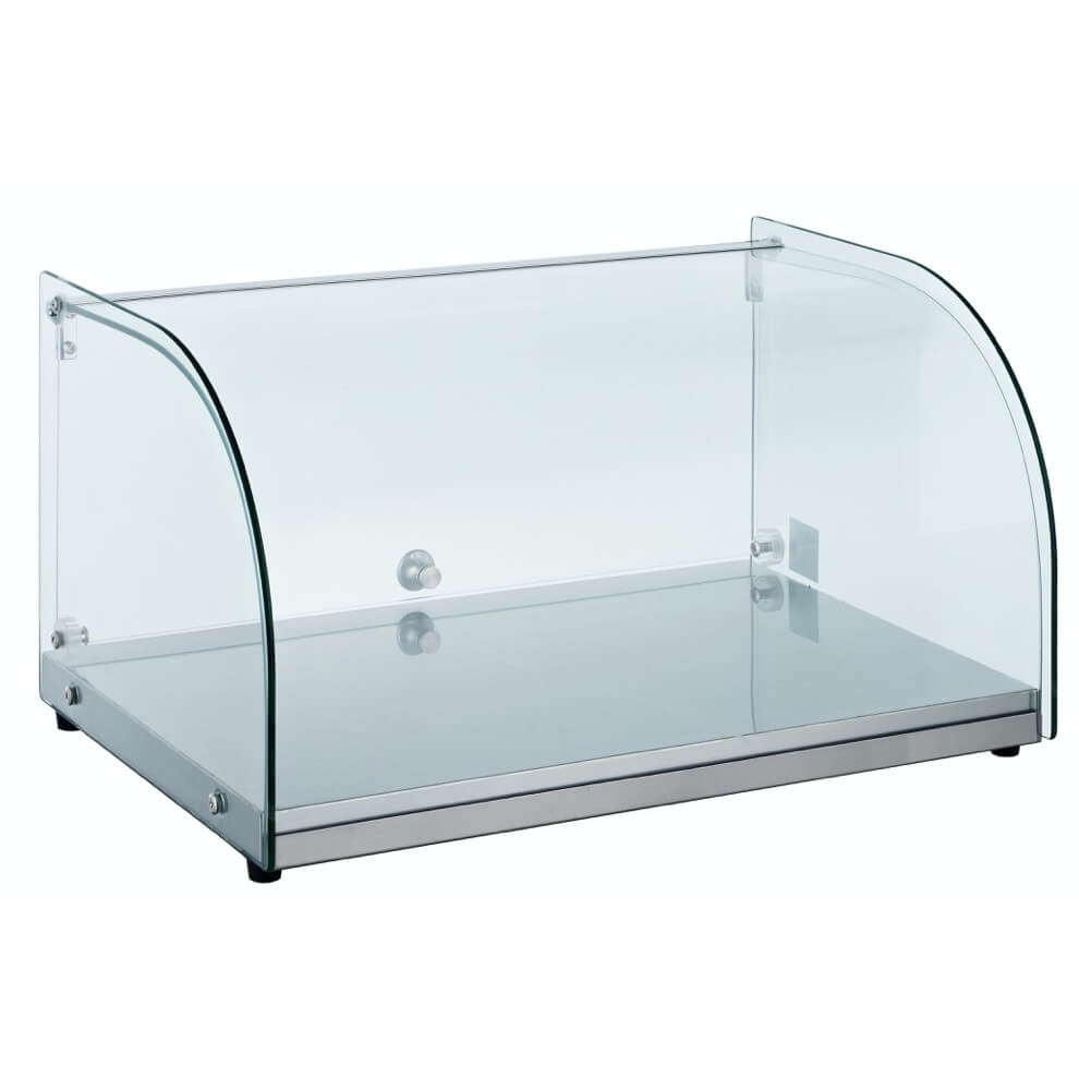 Vetrina con teca in vetro, forma bombata, vetro posteriore apribile a ribalta, piano in acciaio inox 55×37 cm