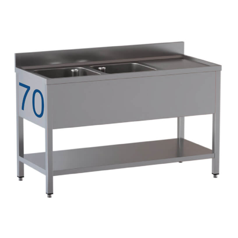 Waschbecken 2 Becken und Tropfschale rechts unten Ablage aus Edelstahl Aisi 430 Tiefe 70 cm