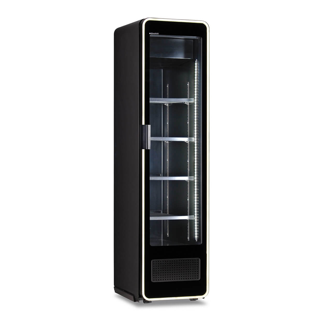 Innovative 550-liter refrigerated display case. Black color. Equipped with internal vertical LED lighting for ample illumination and electronic digital thermostat. The door features an outline that lights up with an integrated LED strip for unparalleled visual impact. Uses gases deemed not harmful to the environment. Anti-fog glass, net volume 537 lt, gross 550 lt.