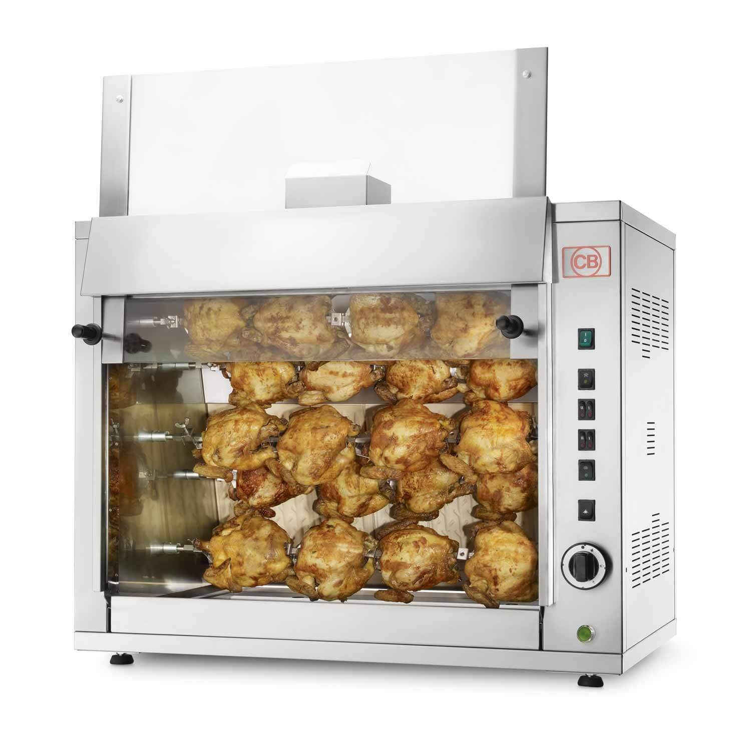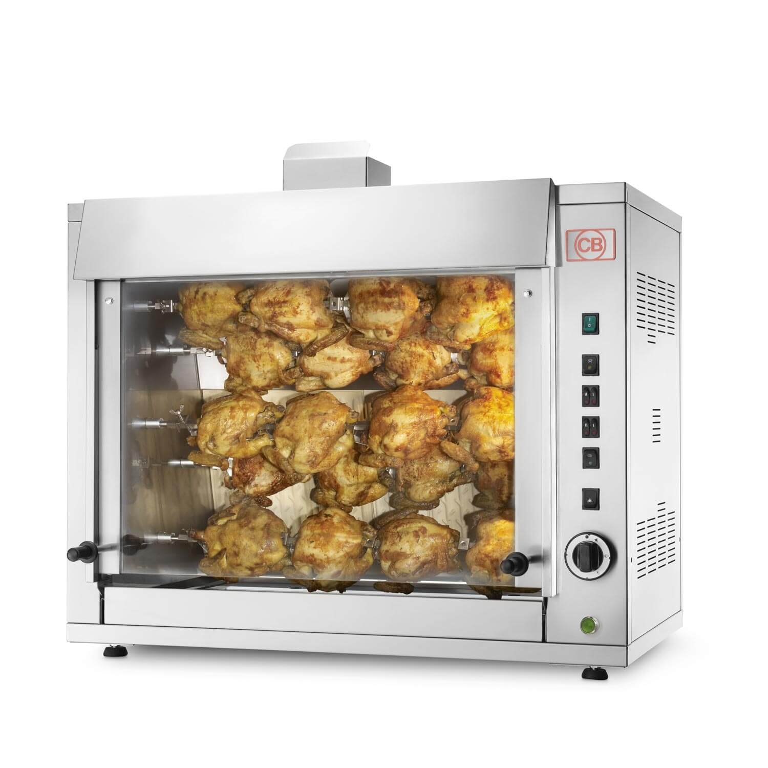 Professional gas rotisserie with single overlapping rods for 20 chickens and 5 rods complete with forks. Cooking technology with infrared burners.