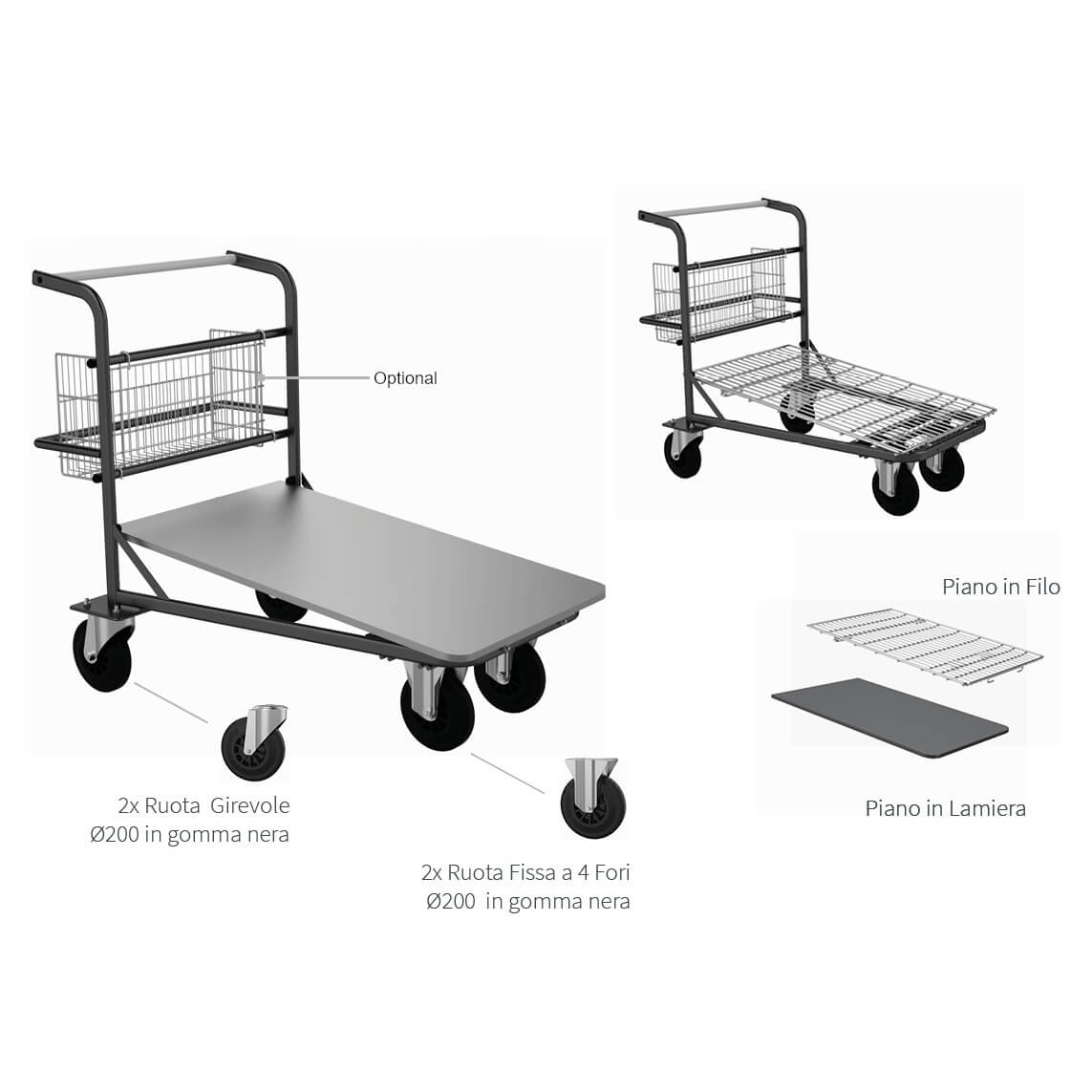 Wheels Ø 200 mm : 2 swivel + 2 fixed.
