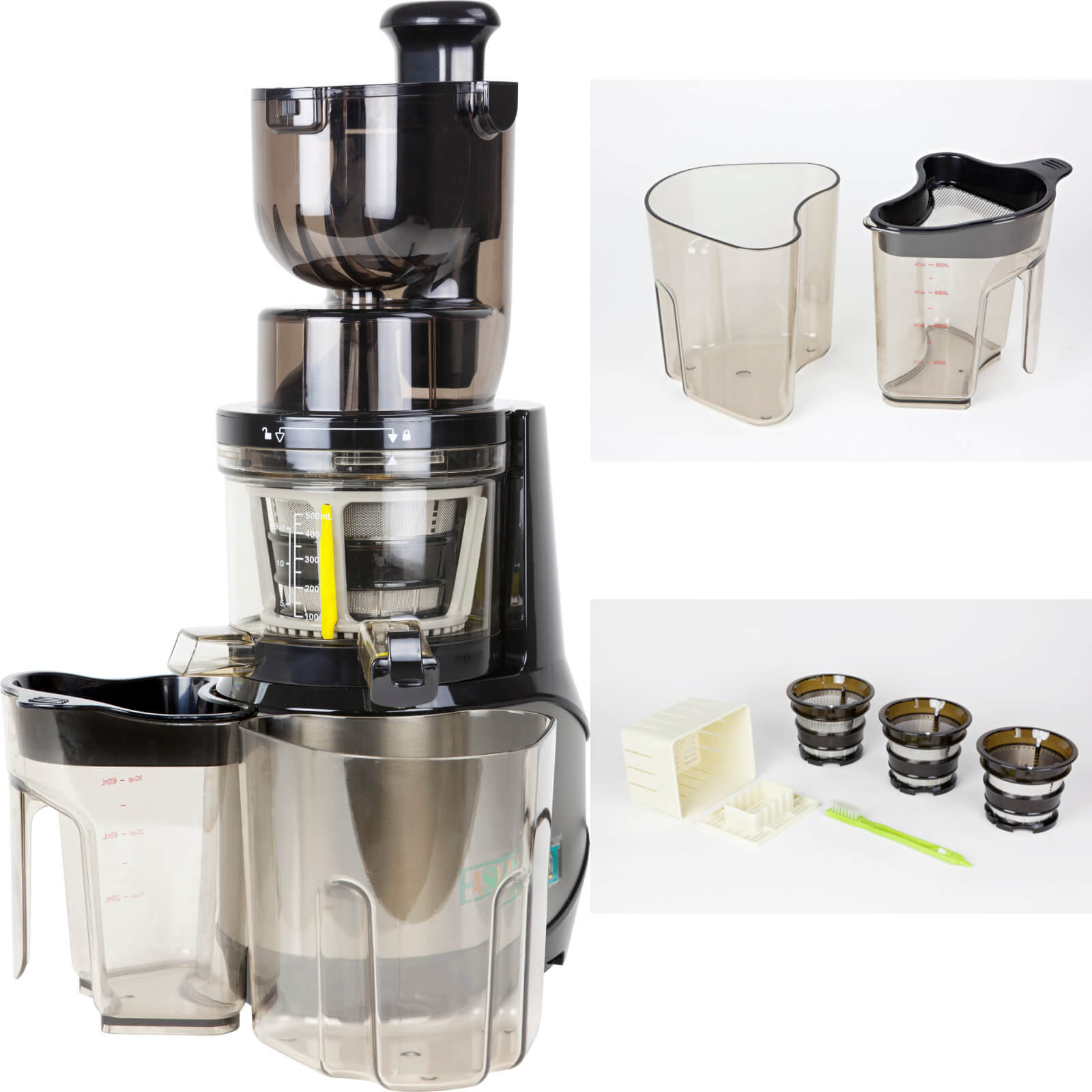 - Includes 2 plastic containers for waste and juice, 1 filter, tofu preparation box, cleaning brush, 3 stainless steel filters.