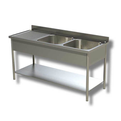Lavatoio in acciaio inox Aisi 430 su 4 gambe tonde ø 50 cm e ripiano inferiore, con 2 vasche e 1 gocciolatoio a sinistra. Vasca profondità 40 cm e altezza 30 cm. Dotato di Alzatina.
