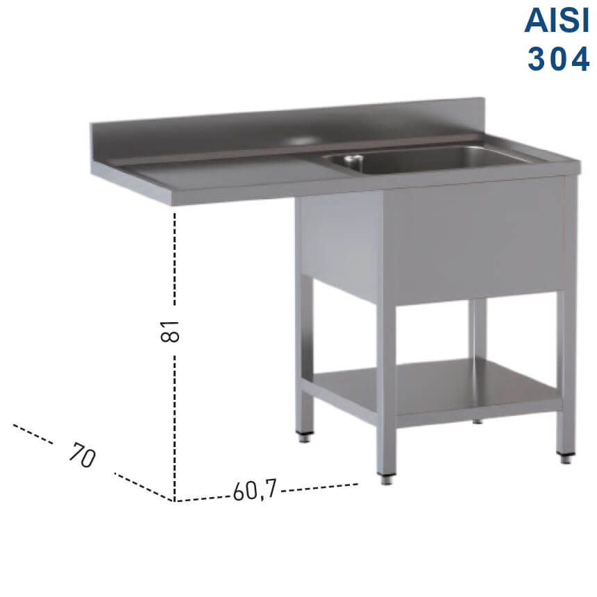 Lavatoio in acciaio inox Aisi 304 a giorno 1 vasca su 4 gambe quadrate e ripiano inferiore, con vano lavastoviglie a sinistra. Vasca 50×50 cm e altezza 30 cm. Dotato di Alzatina.