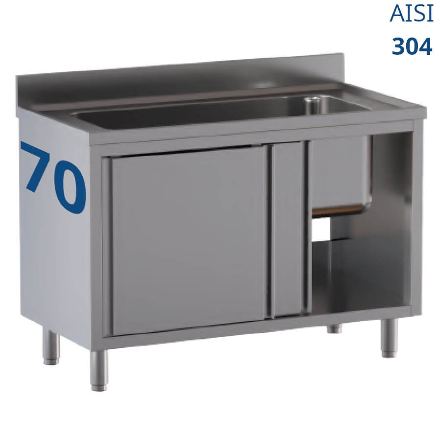 Stainless steel Aisi 304 cabinet sink with sliding doors, with 1 basin. Tub depth 50 cm and height 35 cm. Equipped with splashback.
