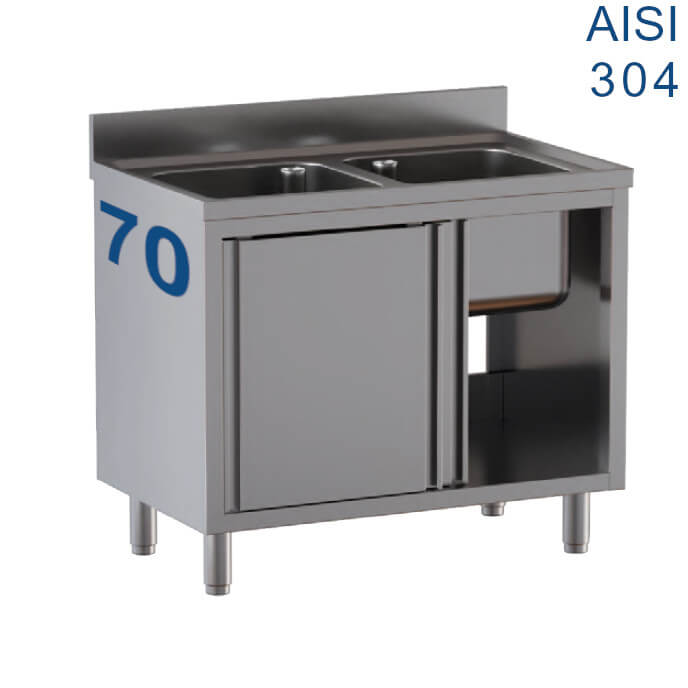 Aisi 304 stainless steel sink on cabinet with sliding doors, with 2 basins. Tub depth 50 cm and height 30 cm. Equipped with splashback.