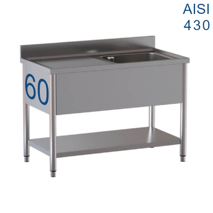 Lavatoio in acciaio inox struttura in Aisi 430, gocciolatoio e vasca in AISI 304, su 4 gambe tonde ø 50 e ripiano inferiore, con 1 vasca e un gocciolatoio a sinistra. Vasca profondità 40 cm e altezza 30 cm. Dotato di Alzatina.