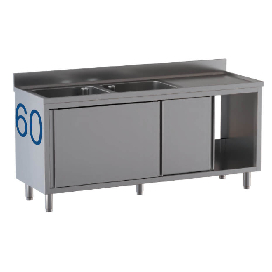 Lavatoio 2 vasche e gocciolatoio a destra armadiato porte scorrevoli acciaio inox Aisi 430 profondità 60 cm