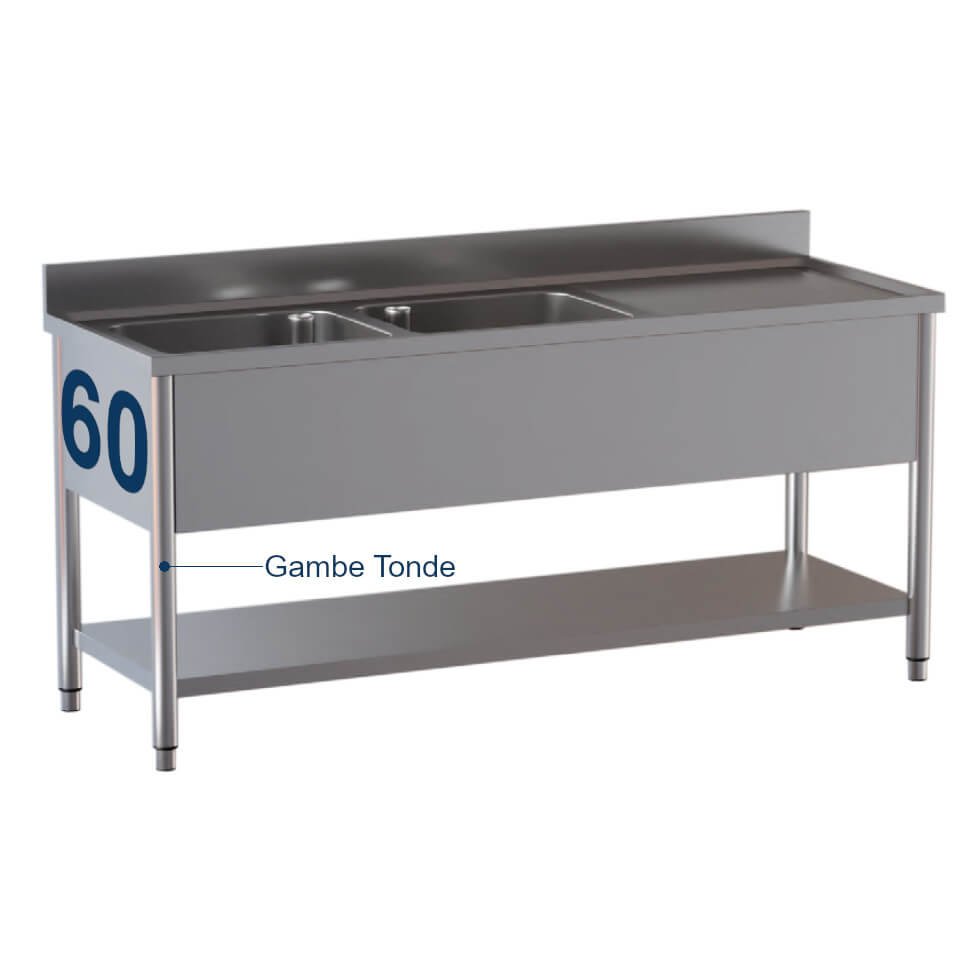 Lavatoio 2 vasche e gocciolatoio a destra ripiano inferiore gambe tonde acciaio inox Aisi 304 profondità 60 cm