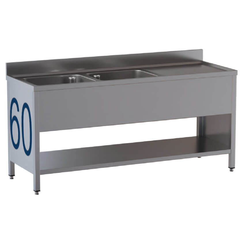 Lavatoio 2 vasche e gocciolatoio a destra su fianchi acciaio inox Aisi 430 profondità 60 cm