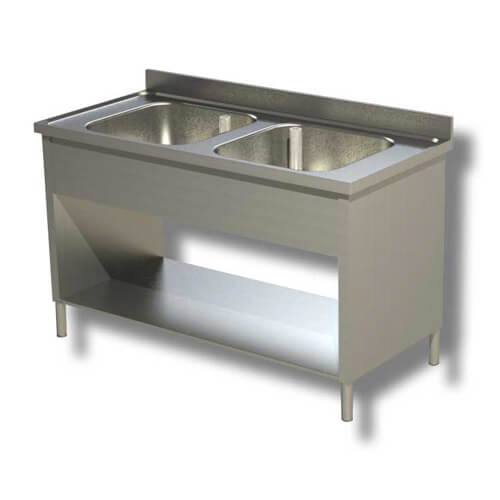 Lavatoio in acciaio inox Aisi 304 su fianchi e ripiano inferiore, con 2 vasche. Vasca profondità 40 cm e altezza 30 cm. Dotato di Alzatina.