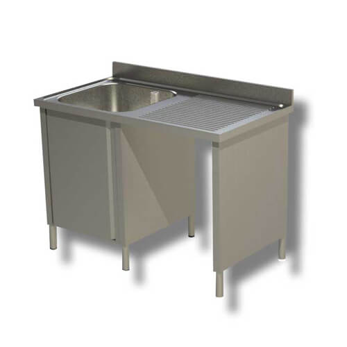 Lavatoio in acciaio inox Aisi 430 a giorno 1 vasca su armadio 1 porta battente, con vano pattumiera e gocciolatoio a destra. Vasca 50×40 cm e altezza 30 cm. Dotato di Alzatina.