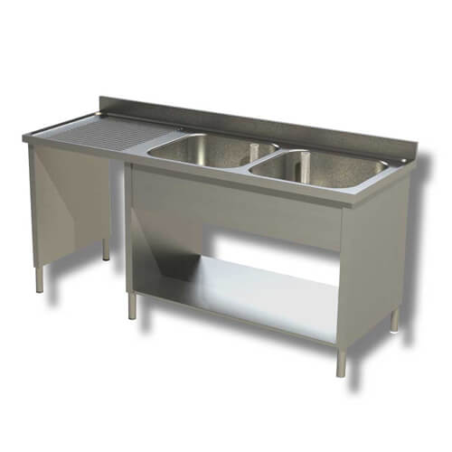 Lavatoio su fianchi 2 vasche vano pattumiera a sinistra acciaio inox Aisi 430 profondità 60 cm