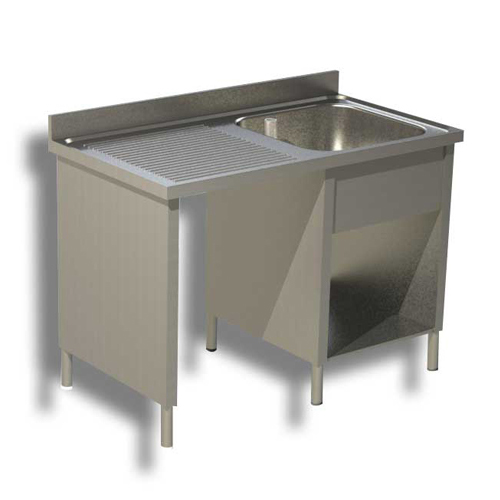 Lavatoio in acciaio inox Aisi 430 a giorno 1 vasca su fianchi e ripiano inferiore, con vano pattumiera e gocciolatoio a sinistra. Vasca 50×40 cm e altezza 30 cm. Dotato di Alzatina.
