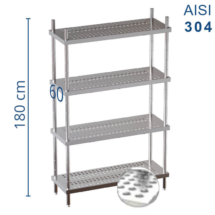 Scaffale in acciaio inox Aisi 304, con 4 ripiani forati profondità 60 cm regolabili in altezza