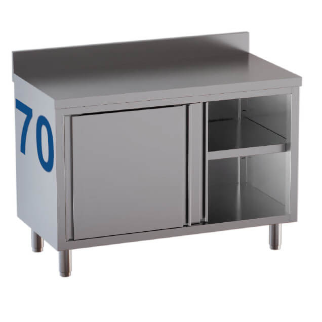 Tavolo armadiato con porte scorrevoli alzatina acciaio Aisi 304 profondità 70 cm